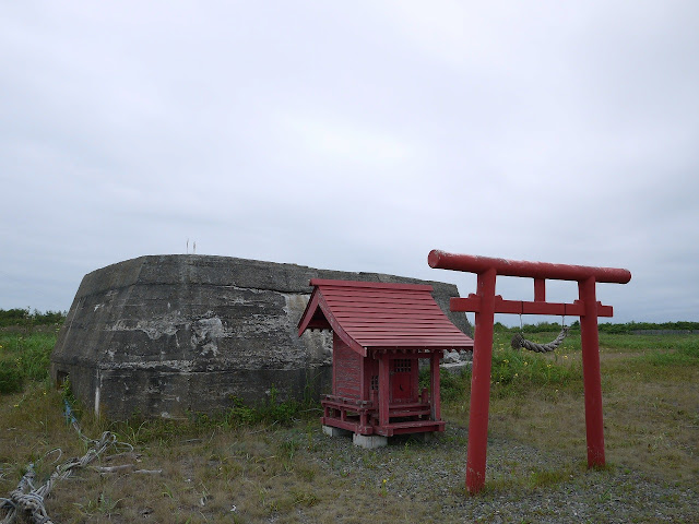 北海道中川郡豊頃町にあるトイトッキ浜トーチカ。トーチカの前には鳥居と祠が設置されているが、どのような経緯で神社と一体になっているのかは不明。
